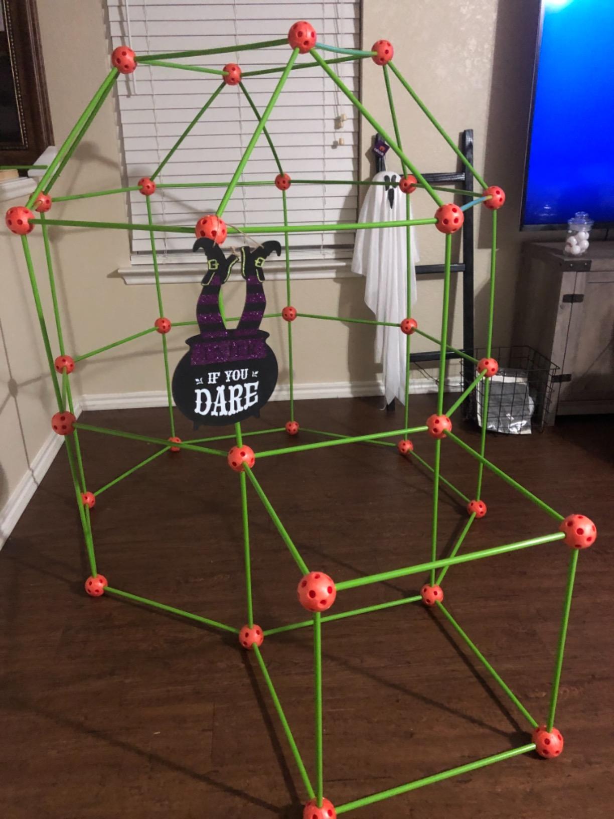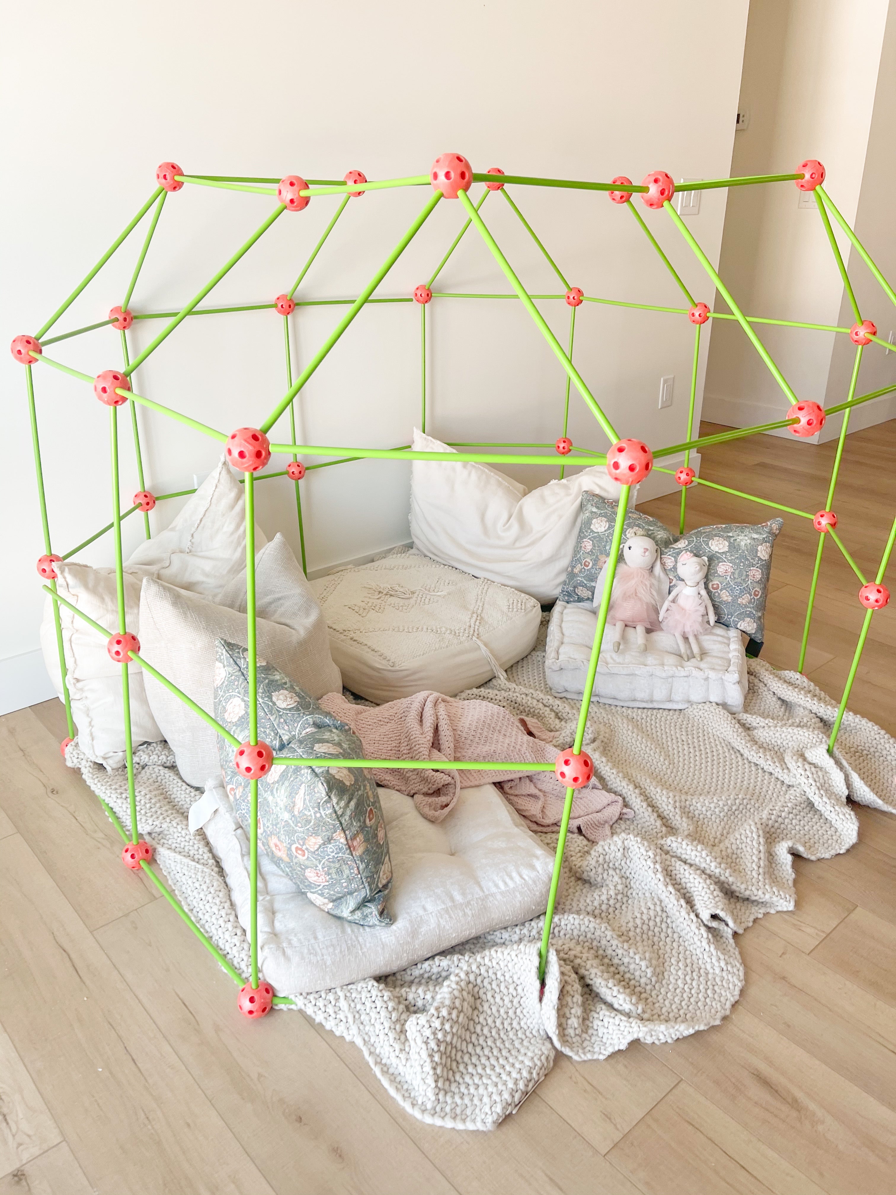 The PopFort is a DIY fort building set designed for kids, featuring flexible rods and colorful connector balls that allow children to create their own unique forts and play structures. It's a fun and imaginative way for kids to enhance their creativity, problem-solving skills, and physical play, both indoors and outdoors.